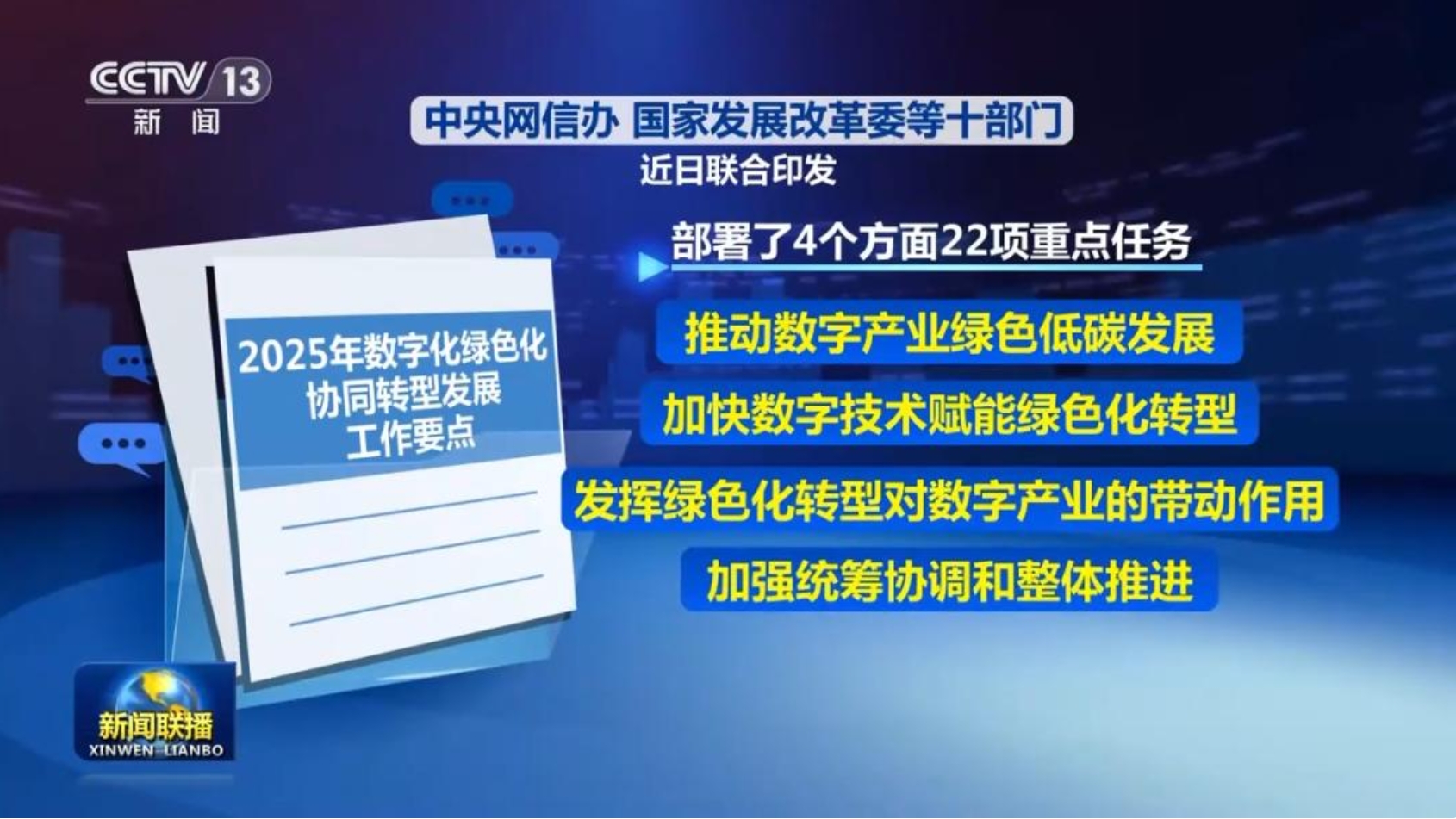 4月25日,中央网信办、国家发展改革委、工业和信息化部等十部门近日联合印发《2025年数字化绿色化协同转型发展工作要点》。工作要点部署了4个方面22项重点任务。4方面重点任务包括:推动数字产业绿色低碳发展,加快数字技术赋能绿色化转型,发挥绿色化转型对数字产业的带动作用,加强统筹协调和整体推进。(新华网)